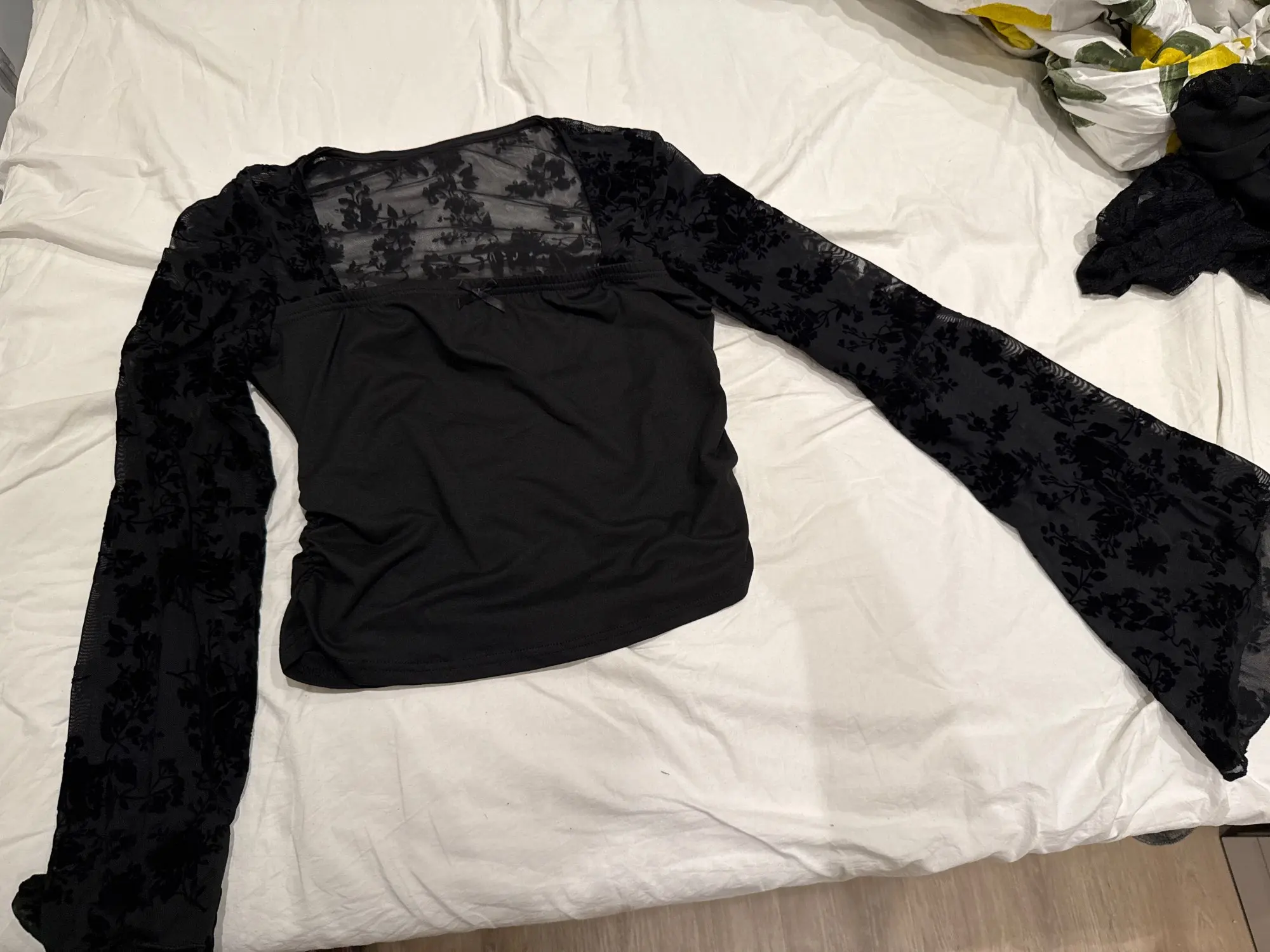 Sheer floral mesh sleeves for a feminine, airy feel 🌸
